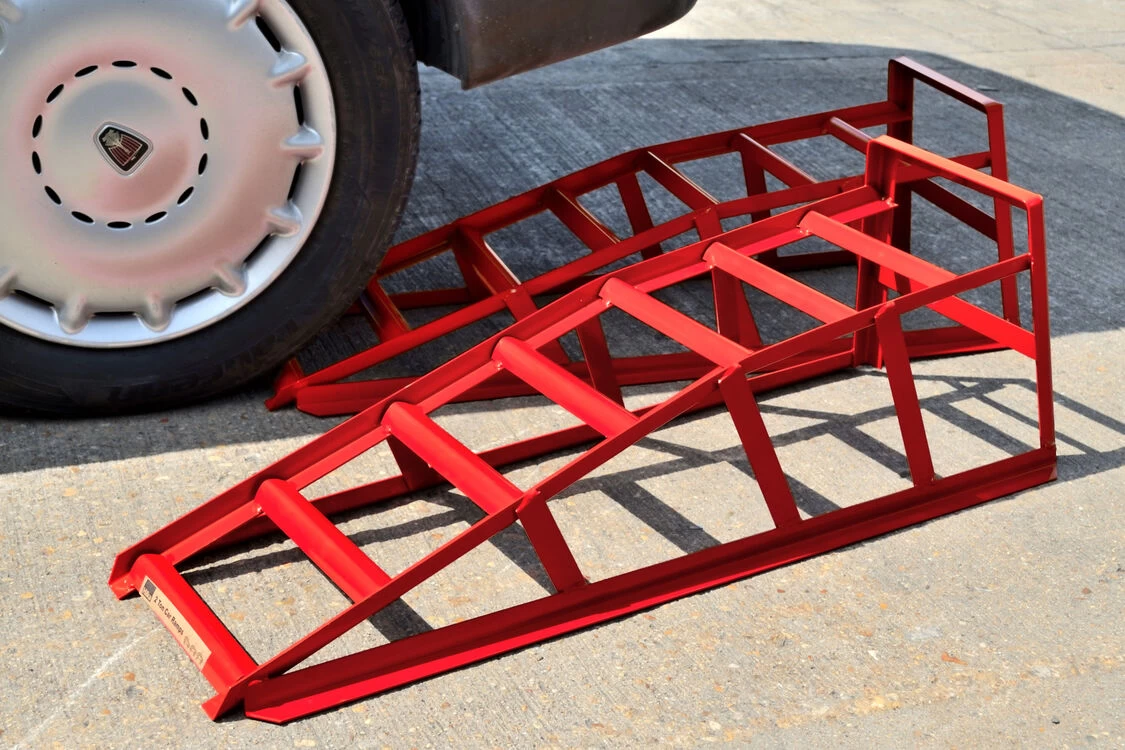 2 Tonne capacity per pair, can raise wheels to 205mm. 215mm wide track. Enables safe working under the vehicle. Angle of incline 20 degrees.