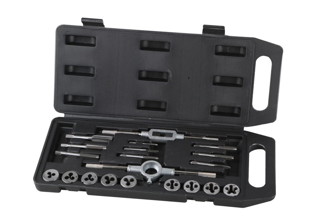 High quality alloy steel containing popular metric tap, dies and holders. Contains: 1 die handle, 1 tap wrench, 1 t-type tap wrench, 1 screw pitch gauge, and 17 tap and dies. Sizes: M3 x 0.5, M3 x 0.6, M4 x 0.7, M4 x 0.75, M5 x 0.8, M5 x 0.9, M6 x 1.0, M6 x 0.75, M7 x 1.0, M7 x 0.75, M8 x 1.25, M8 x 1.0, M10 x 1.5, M10 x 1.25, M12 x 1.75, M12 x 1.5, 1/8-27.