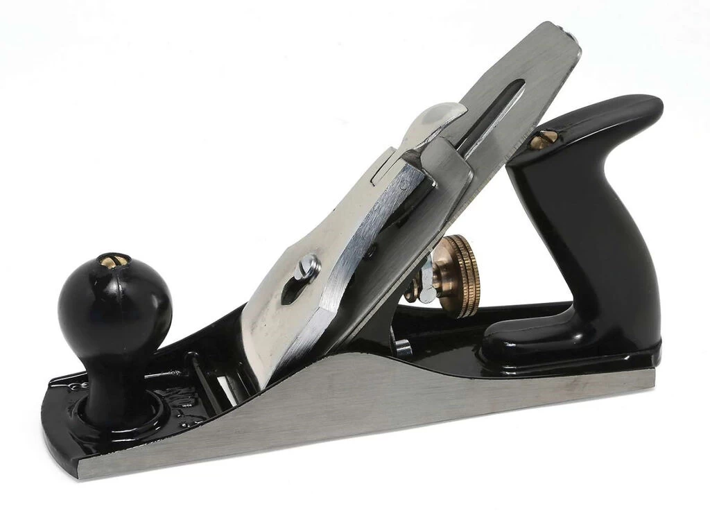 Cast iron body with fully heat treated high carbon steel blade. Chrome plated pressure plate, high gloss plastic handle with brass handle cap and depth adjustment screw.