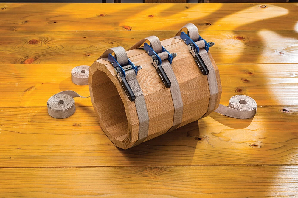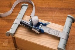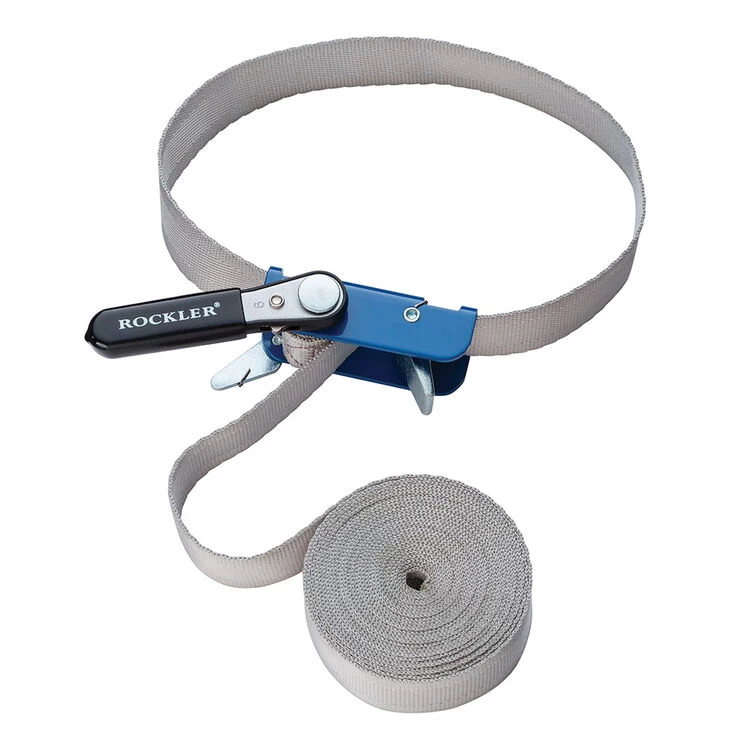 Reinforced webbing with herringbone weave for strength and durability. Nylon material does not stretch under tension. Ratcheting handle is permanently attached to prevent loss. Strap is stitched to ratchet post and improved clamp mechanism further cuts chance of slippage. For use when inward pressure must be exerted to prevent joining surfaces from sliding against each other. Band dimensions W x L: 25mm x 4.58m (1″ x 15′).