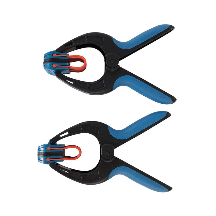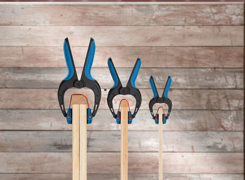 Proprietary rubber band made from a tough, tear-resistant material, with 3 extra-strength splines. Large, ultra-grip clamp pads hold tight without slipping. Pivoting jaws accommodate angled pieces and allow full pad contact regardless of stock thickness. Tension is adjusted by stretching the clamp further into the material. Wood glue flakes off the rubber band material for easy clean up.