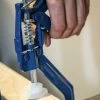 Strong, lightweight construction allows easy clamping and surface alignment of pocket hole joints while the streamlined, ergonomic design enables efficient, comfortable handling. Adjusts quickly for clamping and unclamping. Adjustable handle allows joints to be clamped on bench, not off the edge of the bench. When used with 2 pocket hole joinery, the clamp joins the workpieces as they are screwed together. Clearance in the clamp body enables clamping and fastening of double joints in one easy step. Ratcheting handle allows clamping of face frames flat on the workbench. The adjustable pin fits in a 10mm (3/8″) x 15° pocket hole and on 19mm (3/4″) thick face frames and casework.