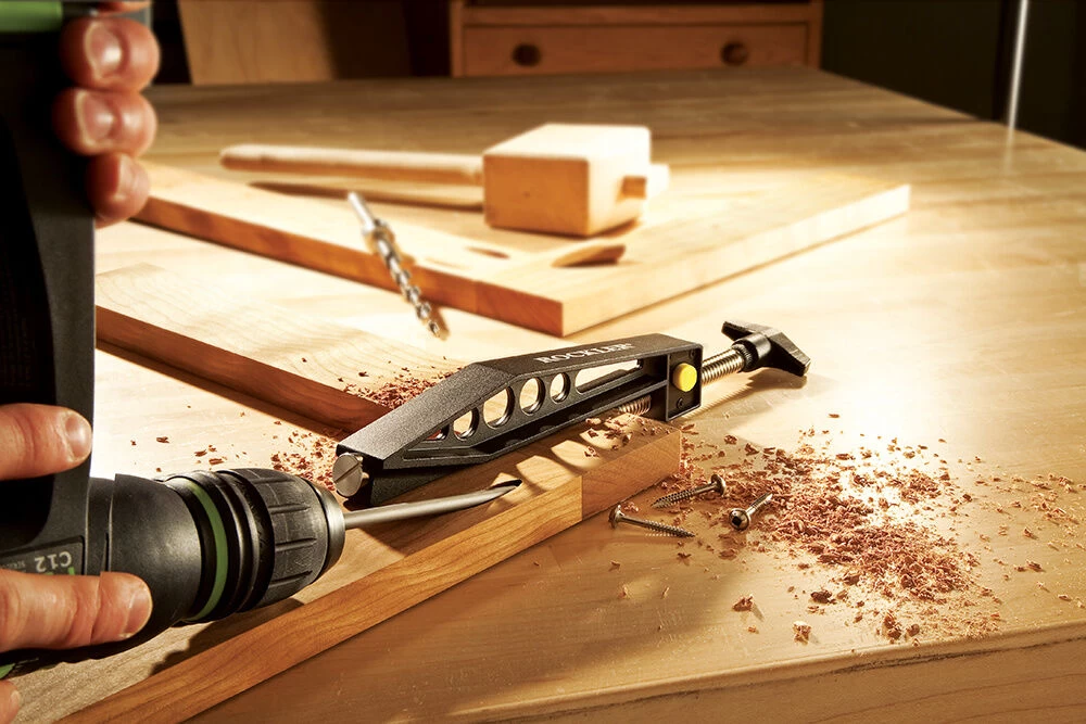 - Integrated adjustable pin fits 9.5mm (3/8″) x 15° pocket hole as clamp tightens joint