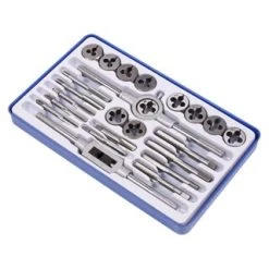 • Contents: Taps & Dies in following sizes; 1/4″-20, 1/4″-28, 5/16″-18, 5/16″-24, 3/8″-16, 3/8″-24, 7/16″-14, 7/16″-20, 1/2″-13, 1/2″-20, 1/8″-27 and double-ended tap wrench and die holder with retention screw.