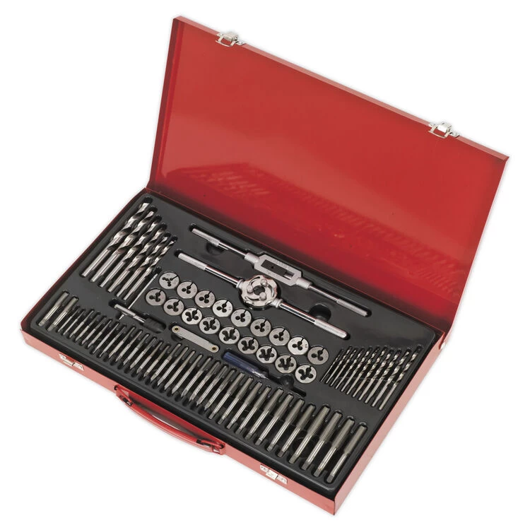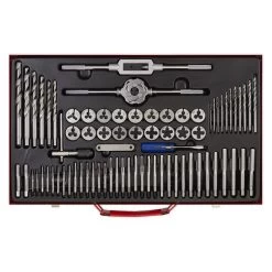 | Contents | Taps & Dies; Coarse – 3 x 0.5, 3.5 x 0.6, 4 x 0.7, 4.5 x 0.75, 5 x 0.8, 6 x 1, 8 x 1.25, 10 x 1.5, 12 x 1.75mm, Fine – 2 x 0.25, 3 x 0.35, 4 x 0.5, 5 x 0.5, 6 x 0.75, 8 x 1, 10 x 1.25, 12 x 1.25mm, Taper & Plug Tap & Die; 1/8″BSP, HSS Drill Bits; 1.7, 2.5, 2.6, 2.9, 3.3, 3.5, 3.8, 4.2, 4.5, 5, 5.3, 6.8, 7, 8.5, 8.8, 10.3, 10.7mm, Tap Wrench, T-Bar Tap Wrench, Die Holder, Thread Gauge, Screwdriver |