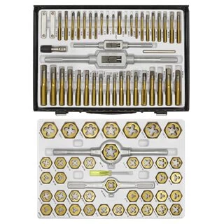 | Contents | Tap and Dies: 3×0.5, 4×0.7, 5×0.8, 6×1, 7×1, 8?1, 8×1.25, 9×1.25, 10×1.5, 10×1.25, 11×1.5, 11×1.25, 12×1.5, 12×1.75, 14×2, 14×1.5, 16×2, 16×1.5mm and 4-40, 6-32, 8-32, 10-24, 10-32, 12-24, 1/2″-13, 1/2″-20, 1/4″-20, 1/4″-28, 1/8″-27, 3/8″-16, 3/8″-24, 5/8″-11, 5/8″-18, 5/16″-18, 5/16″-24, 7/16″-14, 7/16″-20, 9/16″-12, 9/16″-18 and T-handled tap wrench, double-ended tap wrench, die handle, metric & imperial thread gauge and screwdriver |