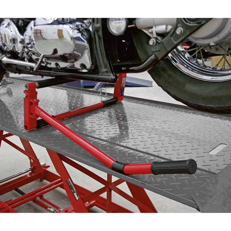 • Quickly and safely lifts and stabilises front or back of a motorcycle with a traditional style double cradle frame design that has no engine, transmission or exhaust protrusions.